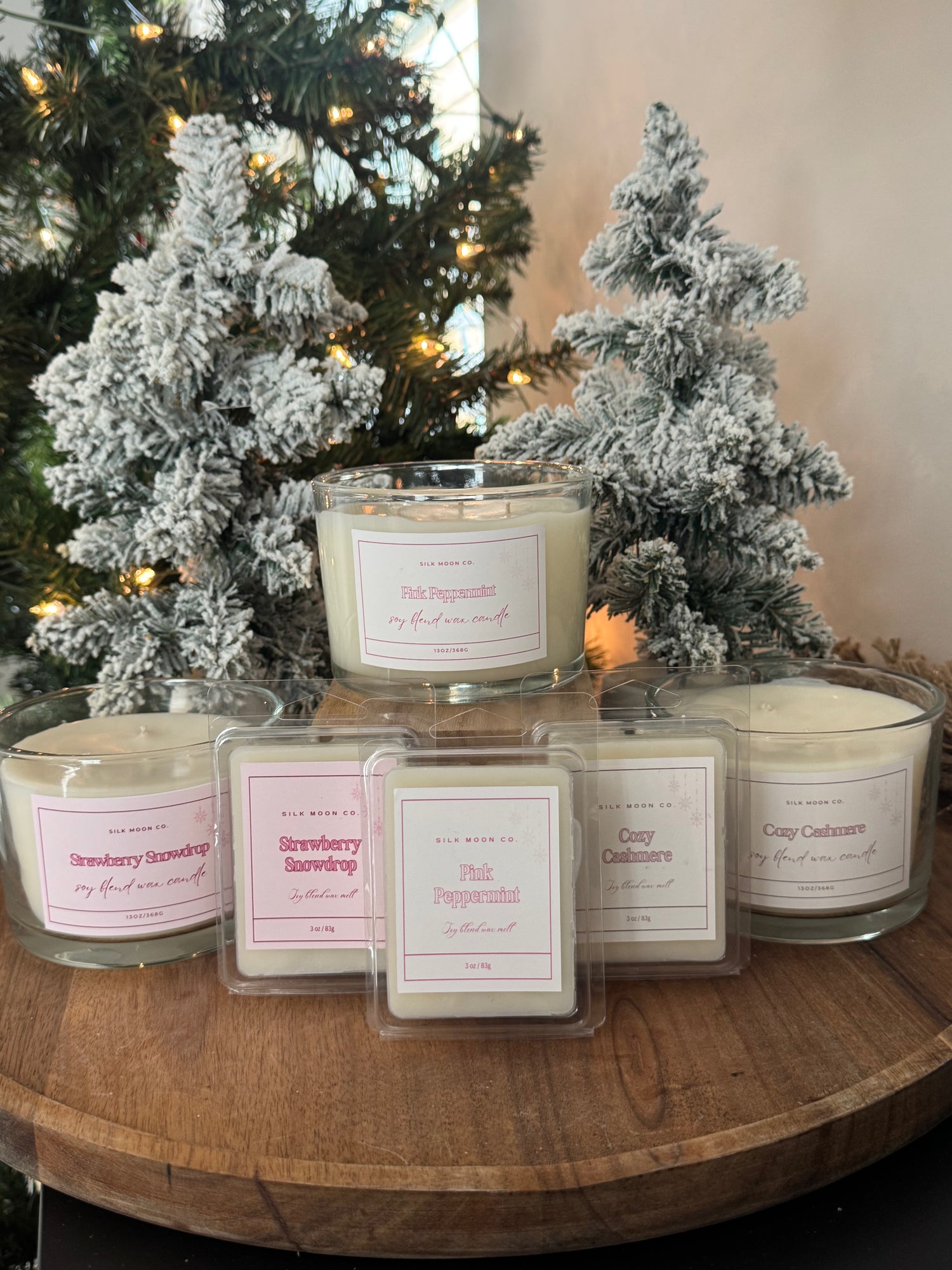 The holidays just got sweeter with the Silk Moon Christmas Collection, featuring three festive scents designed to fill your home with warmth and cheer. Indulge in the cool, refreshing aroma of Pink Peppermint, wrap yourself in the cozy embrace of Cozy Cashmere, or delight in the sweet, delicate scent of Strawberry Snowdrop.